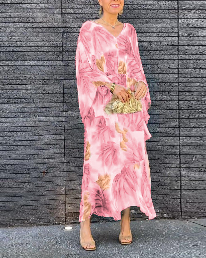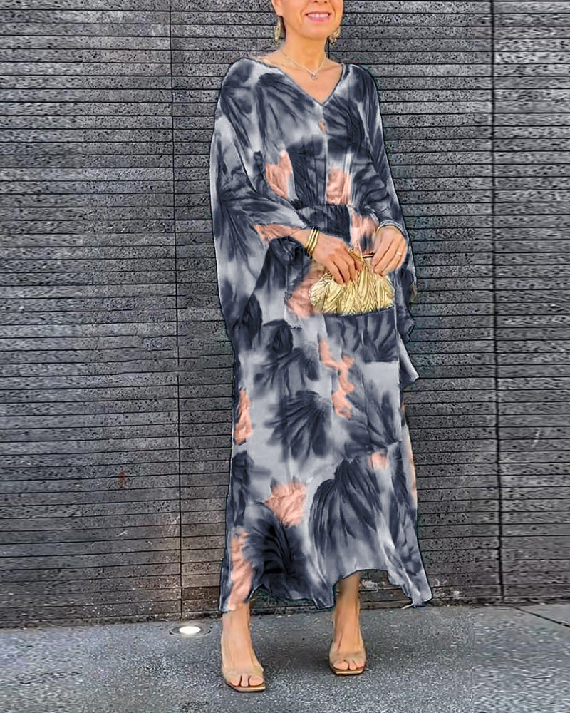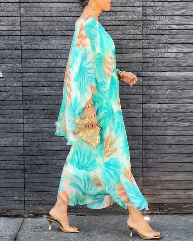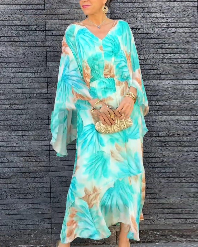 Elegancka, zwiewna sukienka z nadrukiem i dekoltem w kształcie litery V